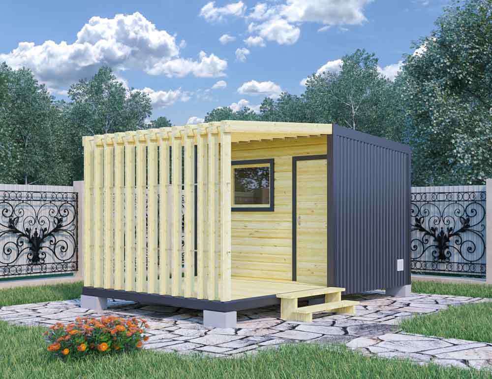 Бытовка для дачи в стиле хай-тек с цветным профлистом 3х2.43х2,47,2ДВП-Оргалит:
